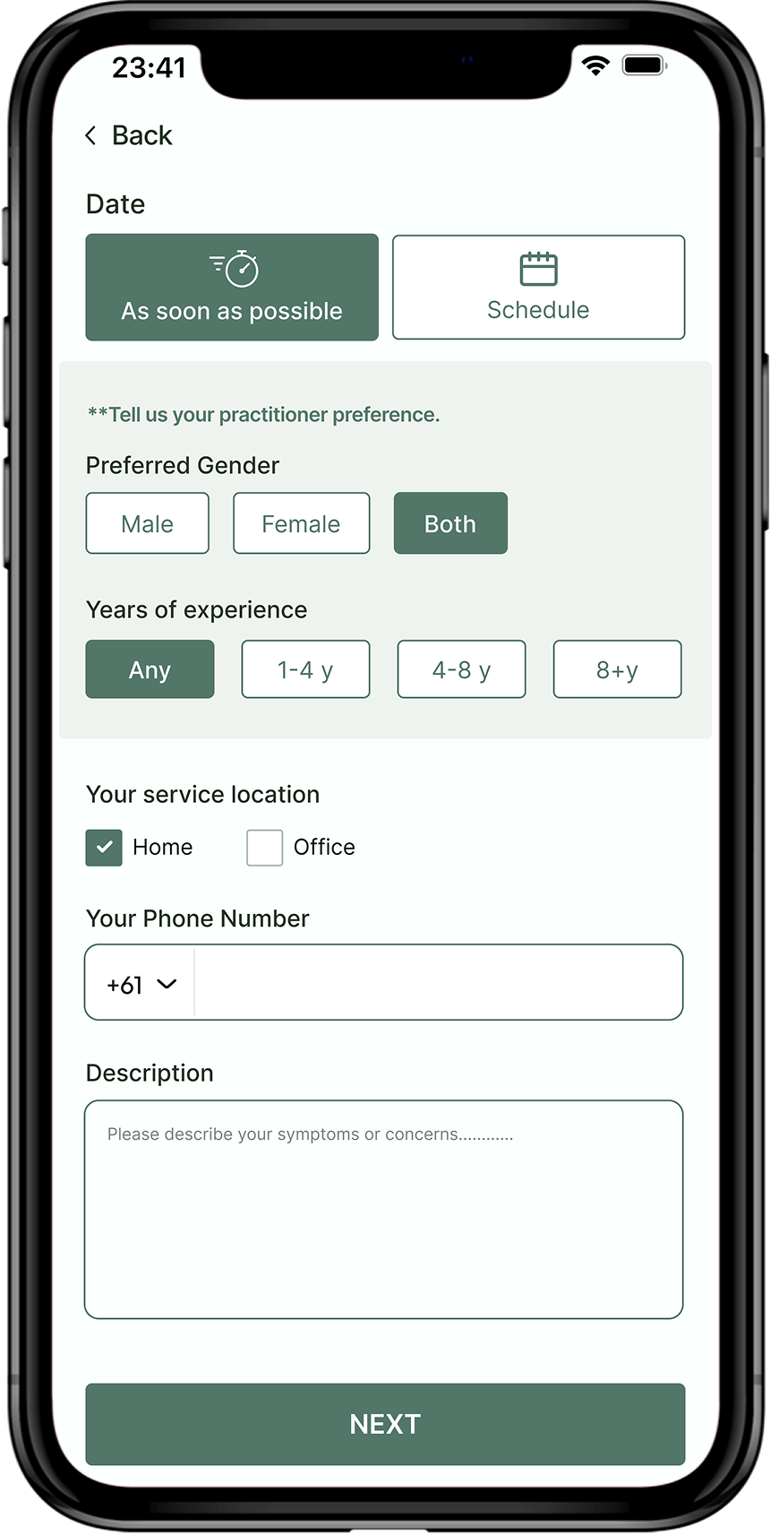 - Get Matched Instantly: Our smart tech connects you to the nearest available practitioner in seconds.